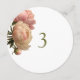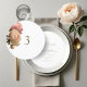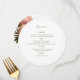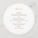 Stylish and chic. This round wedding card includes table number and wedding menu on either side. The design includes a contemporary set of fonts in olive green against a crips white background. The template includes 4 meal and drink sections.