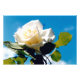 White rose under blue sky. Vibrant photo of a beautiful blooming rose makes a great floral wall art gift. The calm beauty of white rose reflects new beginnings, purity,loyalty and innocence. White roses symbolise the young love that the bride has for her spouse. White roses also symbolise the foundation of a relationship, which is why they are often seen on a wedding day. The white rose is a traditional wedding flower. White rose is a fitting flower for celebrating a new romantic and marital bond.