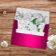 A charming and very chic metallic dark pink wedding envelope. On the inside is a beautiful large, white bridal bouquet of gorgeous white roses.