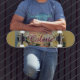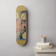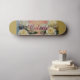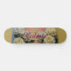 This skateboard features a digital photo of six white roses with blue striped petals on a gradient background. The skateboard has a professional quality skateboard deck made from the best ingredients. The skateboard is made with seven plies of premium USA Maple. The deck is 7 7/8 inches. The roses are arranged in a symmetrical pattern, with three roses on the left side and two on the right side. The background features a soft gradient from coral pink at the top to gold with a decorative pattern of small metallic spheres in the centre. The image has a vintage, painted quality. The name Colette is in wine script centred on the skateboard. You can replace the name by clicking the Personalise button