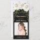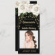 Elegant Quinceañera 15th birthday party ticket invitation for girls with beautiful, white roses/flowers with gold glitter and sparkly star string lights on a black background. Ticket has text, "Admit one". Personalise by adding your party information and your photo.