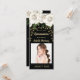 Elegant Quinceañera 15th birthday party ticket invitation for girls with beautiful, white roses/flowers with gold glitter and sparkly star string lights on a black background. Ticket has text, "Admit one". Personalise by adding your party information and your photo.