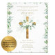 Elegant Christian, Catholic faith wedding invitation with text template fields both sides for you to include wedding ceremony, reception, rsvp, gift registry brief order of the day program. White Roses, greenery leaves, gold cross decorated invitation.