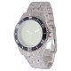 Has heft and feel of expensive stainless steel quartz watches. Good band with safety catch. I removed links, which is easy because engraved arrows show direction to push the linking pins. As always by this seller, the image (a railroad logo) is a perfect reproduction of my emailed image, and is precisely spaced and aligned.