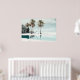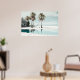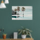This poster features a serene image of a white sand beach, dotted with palm trees that sway in the breeze. The turquoise water of the ocean adds a pop of colour to the scene, creating a tranquil and peaceful atmosphere that extends to the horizon.