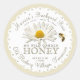 Dainty white scallop on pale ivory honey label with realistic daisy and honeybee. "HONEY" printed in an old fashioned font and Apiary name and Location are printed in a beautiful, readable script font.