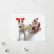 white schnoodle standing with red christmas holiday card
