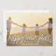 Happy New Year Script in bright white, wishing your loved ones in style. Your photo on the back or current backing pattern. Traditional Calligraphy style. Lettering style. Big photo design. Happy, festive design.