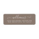 White Script Taupe Gray Return Address Label featuring elegant white script for the name paired with clean uppercase address text on a soft taupe gray background. The elongated rounded layout offers excellent readability while maintaining a warm, modern look, making it ideal for wedding stationery, everyday mail, holiday cards, housewarming gifts, or professional correspondence. A polished choice for those who prefer neutral tones with classic script styling. Easily personalize with your details.