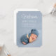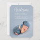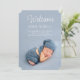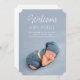 Full frame photo white "Welcome" baby announcement flat card. Introducing a baby 2 photo card with modern, elegant white lettering, custom photo, baby's name and birth details on the front in white. Back features a photo and sample announcement text for family and friends in grey. Use the easy-to-customise template and share your personal moments of happiness with family and friends. © y.BEE PAPERIE #ZazzleMade #birthannouncement #birthannouncementcard #babyannouncement