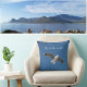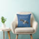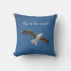 This throw pillow features a Seagull photographed from below, with outstretched wings flying in the wind. The body of the bird is white, the tail is white, the wings are grey underneath, and the far edges of wingtips are black, then white, then black again, before the grey starts, going from the outside towards the body. The sky background is a lovely deep blue colour. The wording is centred, in white italic, and reads "Fly in the wind!" This can be changed and customised to suit your desired wording.