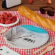 Paper plates with a gorgeous photograph. Tropical blue water and foamy surf in the background. A collection of seashells and stems set on a white sandy beach.