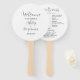 Wedding day ceremony program on a round style hand fan that features a white background with the bride and groom names and date on front side of fan, along with dark grey, stylised script listing the wedding party participants and ceremony rites on back side of fan. Edit hand fan and replace names and info with your own wedding program info. Perfect for a summer, outdoor wedding venue! Select number of hand fans desired.