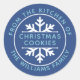 From the kitchen of sticker for your baked Christmas goods. A round sticker in blue and white for Christmas baking. Blue curved text around a white snowflake. Add your name.