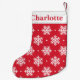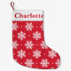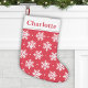 Christmas stocking features a two-sided red design (colour can be customised) with white winter snowflake and dots pattern. Personalise the custom dark grey script text with a family member's name.