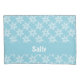 White snowflakes on blue pillowcase