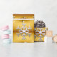 A golden Christmas wraping paper with a pattern of large, white snowflakes. They're surrounded by white stars of different sizes, tiny white sparkles and small black stars, all on an elegant gold gradient pattern background for a real festive touch.