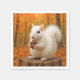 A fluffy white squirrel with bright eyes holds an acorn while sitting on a tree stump, set against a backdrop of vibrant autumn foliage