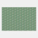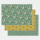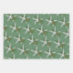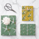 Sheets of wrapping paper with white sea stars pattern. Gold and green paper set with each of three papers containing realistic white starfish wrapped in holly leaves. The patterns are various sizes in this variety set.