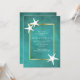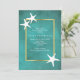White starfish on teal stained grunge paper modern beach wedding engagement party invitation or invite featuring a gold frame on dark aqua teal blue background and white starfish on the corners. This elegant summer wedding design is part of a wedding set or collection and is a totally customisable template perfect for a beach destination summer wedding.