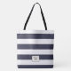 This all over printed tote bag might look simple. White horizontal stripes, a hardly noticeable shadow effect, a rectangular monogram holding your initial letter. But there is so much more! You can replace dark blue with any colour of your choice, making your bag one of a kind!
