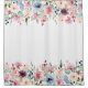 This window curtain design features a white and light grey vertical stripes background with colourful spring flowers top and bottom border.