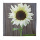 a rare white sunflower that is a hybrid called Coconut Ice in front of a weathered fence