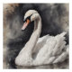 A white Swan with detailed watercolor with expressive eyes is portrayed against a soft, blurred background. The natural colours enhance the lifelike appearance.