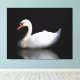 White mute swan floating in a lake with reflection in the water against black background. Low key.