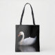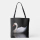 White mute swan floating in a lake with reflection in the water against black background. Low key.