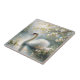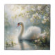 Ceramic tile features a dreamy oil painting of an elegant white swan gliding across a serene springtime pond or lake.