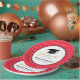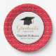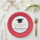 This graduation paper (disposable) plate features a graphic of a graduation hat (mortarboard) and customisable text for: Class of, Graduates Name, Name of School. This paper plate is accented with a white swirl pattern on a red background.