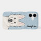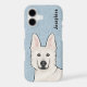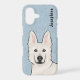 Destei's original cartoon illustration of a cute White Swiss Shepherd / white colour German Shepherd breed dog's head. The background colour is blue with a decorative texture. The texture can be removed and the background colour can be changed to any other colour, if so wished. There is also a personalizable text area for a name or other custom text.