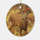 This ornament features a delicate brown white-tailed deer grazing through the grass of an open field. She has stopped and turned her head because she heard a noise. Her big ears are alert. The face has white markings around the eyes and nose. She is surrounded by autumn colours of red, yellow, green, orange and gold.