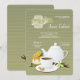 A tea party invitation featuring a white teapot, cup and saucer, next to an orange topped cheese cake. (<a href='https://www.freepik.com/free-vector/tea-party-poster_1530872.htm'>Designed by Freepik</a>). <br/><br/>The card is easy to customise with your wording, font, font colour and choice of six paper types.<br/><br/>Not exactly what you're looking for? All our products can be custom designed to meet your needs at no extra charge.<br/><br/>Simply contact us at askcottonlamb@gmail.com<br/><br/>Coordinating products available: