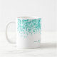 A stylish white background, decorated with teal, sea green faux glitter dust. Personalise and add your name written with a trendy hand lettered style script with swashes.