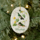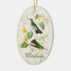 Two bright green hummingbirds with black and white face masks perch on a tropical vine with yellow flowers, on a light gold marble texture background. Personalisation options on front and back, or remove text for an elegant nature-inspired addition to any Christmas tree. Perfect all occasion gift for hummingbird lovers.