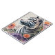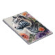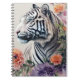 Watercolor artwork features a striking white tiger with blue eyes surrounded by peach and purple flowers, a juxtaposition of wild animal danger and fragile flora beauty. A fierce feline side profile image with a feminine floral aesthetic.