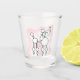 Shot glass with a snooty poodle illustration. A stylised poodle with pom poms and a pout on a powdery pink background.