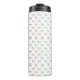 "White travel mug with black lid featuring a colorful, repetitive abstract pattern of triangles and lines in red, blue, green, and yellow. The pattern creates a vibrant and playful tone."