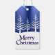 Christmas gift tags with white pine tree silhouettes on snowy hills against a midnight blue sky and "Merry Christmas" greeting. Sample message on reverse to replace with your own text.
