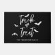 Welcome guests with Halloween spirit using this modern doormat. The design features Trick or Treat in crisp white script typography with playful bat silhouettes against a bold black background. A personalizable text area beneath the design allows you to add a family name or custom welcome message, making it a unique and festive touch for your entryway during the spooky season.