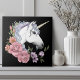A white unicorn with pink, peach and lavender coloured flowers in a backdrop of black