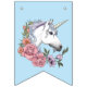 A white unicorn in profile is surrounded by pink, coral, and lavender flowers against a soft blue background.
