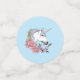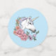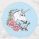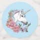 A white unicorn in profile is surrounded by pink, coral, and lavender flowers against a soft blue background.