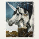 An American Curl tabby cat on a fence with a white Unicorn in behind is a winter day.