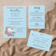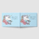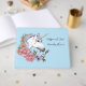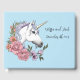 A white unicorn in profile is surrounded by pink, coral, and lavender flowers against a soft blue background.