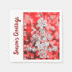 Share a greeting design with party attendees featuring a white Christmas tree ornament and snowflakes over a red bokeh background. Personalise the template text fields, remove text and/or click customise to select a font style, size and colour you prefer.