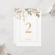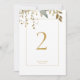 Chic and elegant. This gorgeous white wedding table number features watercolor ffoliage detail with imitation gold accents. The design includes a contemporary font in imitation gold set inside a thin golden taupe frame. The design is repeated at the back.