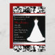 Formal bridal shower invitation done in a black, white damask pattern, on the top and bottom. A lovely wedding dress on a decorative stand decorates the right side of the invitation, and red border edges a white satin looking ribbon, on each side of the black text area. Customise the text to suit your party needs.